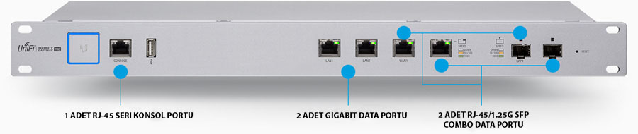 UBNT UniFi Security Gateway ürün grubunun, büyük ölçekli kurumsal ağ ihtiyaçlarını karşılamak için tasarlanmış UBNT UniFi USG-PRO-4PORT modeli ,VLAN arayüzleri, Static Routes ve OSPF, RIP, BGP gibi yönlendirme protokolleri, Güvenlik Duvarı ilkeleri(Firewall Policies), NAT kuralları, DHCP Servisleri, QoS, IPv6, DPI (Deep Packet Inspection), Ağ yönetimi ve izleme araçları gibi gelişmiş özellikleri halihazırda sunmaktadır. UniFi Contoller üzerinden sununlan grafik ara yüz haricinde tecrübeli ağ yöneticileri için SSH veya Telnet üzerinden erişip Linux araçları ve Kabuk komutları ile yönetebilecekleri CLI tabanlı yönetim arayüz alternatifi de bulunmaktadır. .